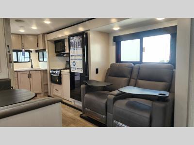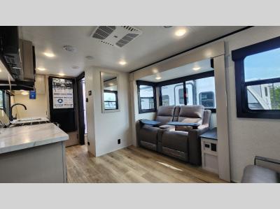 You will love the seamless countertops throughout, along with the stylish interior and the new InVision appliance package. A 13,500 BTU roof.mounted Quiet Series A/C will keep you comfortable, while the MaxxAir vent fan in bathroom and living room allows for even more comfort, and the on-demand water heater means everyone can freshen up before bed. Each model is constructed with a Magnum Truss roof system and Stronghold VBL walls with double-sided Azdel composite, so you can plan to enjoy your Jay Feather for years to come.