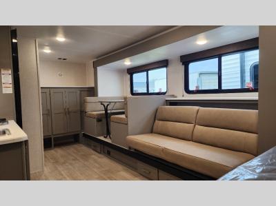 Head to the lake in this spacious trailer that can sleep five to six each night. There is a front queen bed for you, plus a sofa and booth dinette within the large slide out that doubles as seating and sleeping space. You will also find storage drawers below, and there is a pantry and closet along the rear wall for all your goodies and such. The cook will love the galley kitchen with a two burner cooktop and a 7.7 cu. ft. refrigerator for food storage. The TV prep means you can bring along your television for movie nights, and the countertop behind the sofa provides more space for belongings!